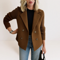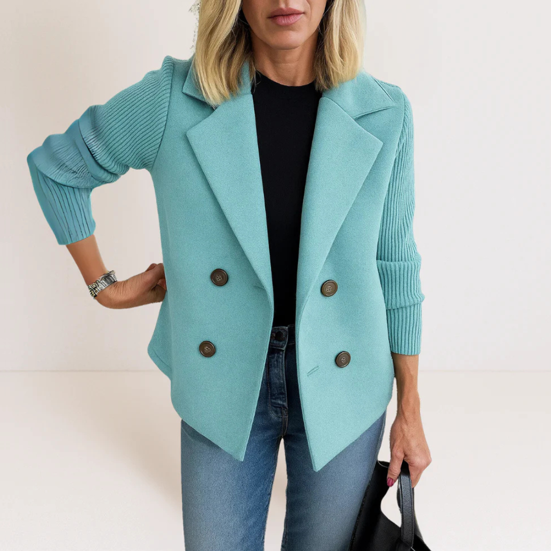 Die Isabelle Elegante Jacke mit Strickärmeln vereint die klassische Struktur eines Blazers mit der modernen Weichheit des Stricks und schafft so ein Kleidungsstück, das Raffinesse und Komfort harmonisch verbindet. Das taillierte Doppelreiher-Design betont die feminine Silhouette, während die fein gerippten Strickärmel Leichtigkeit und Bewegung verleihen. Eine perfekte Balance zwischen Form und Fluss – ideal für Frauen, die in jeder Situation Eleganz ausstrahlen möchten.